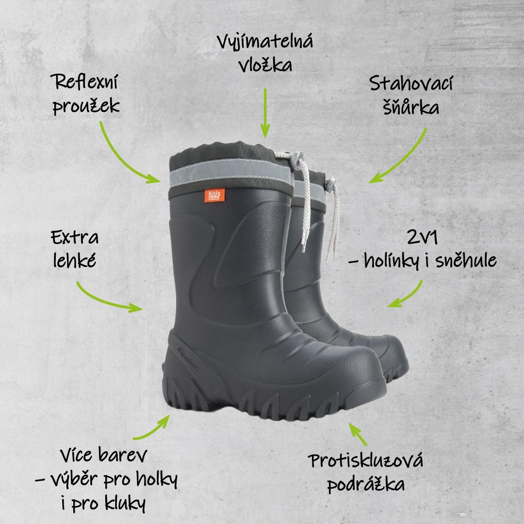 Holínky MAMMUT byly navrženy tak, aby děti měly nožičky v teple, suchu a maximálním pohodlí v každém počasí. Díky vložce z pravé ovčí vlny udrží teplo i při mrazech do -30 °C a přitom jsou ultra lehké – děti je téměř necítí na nohou.